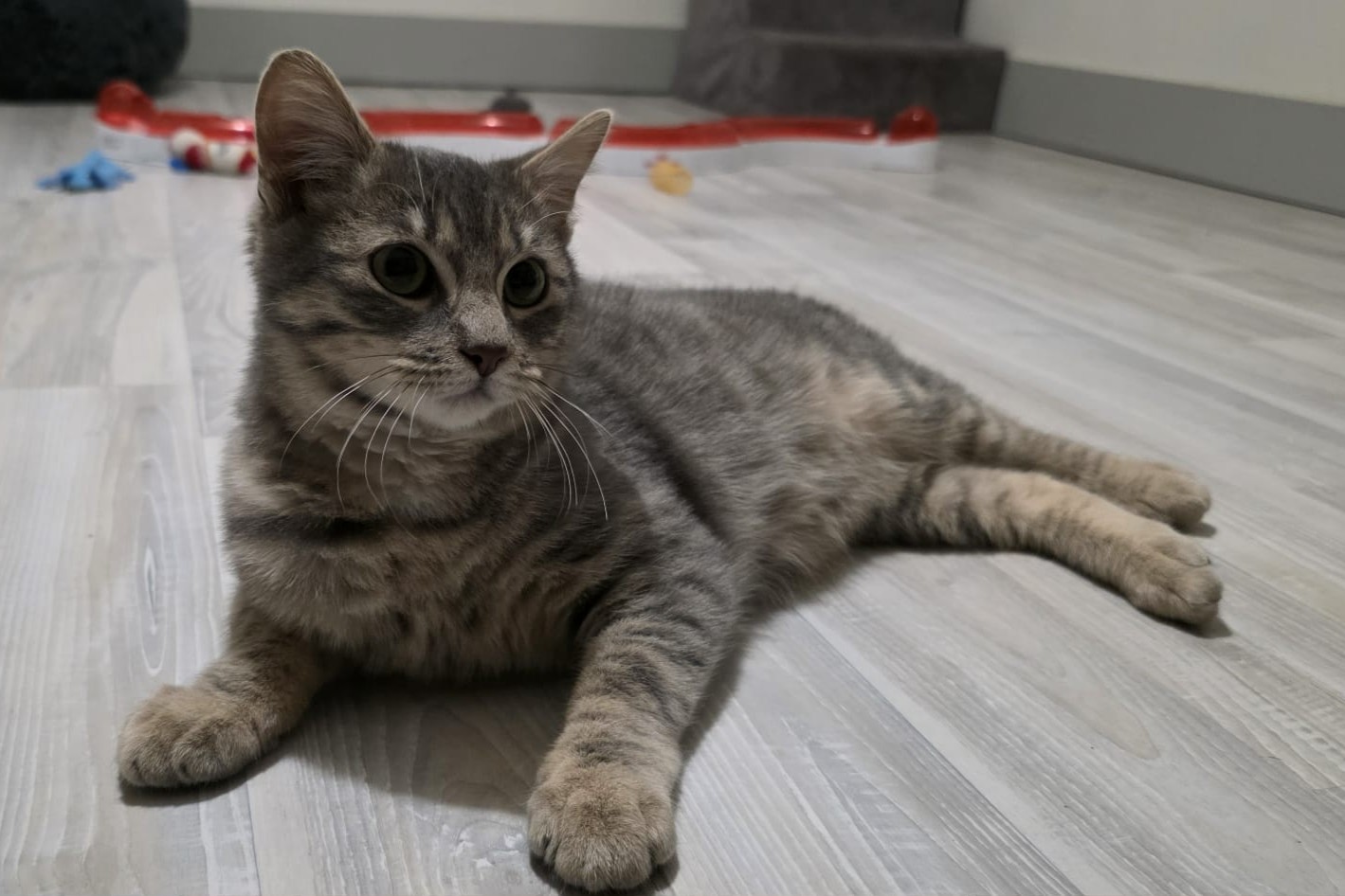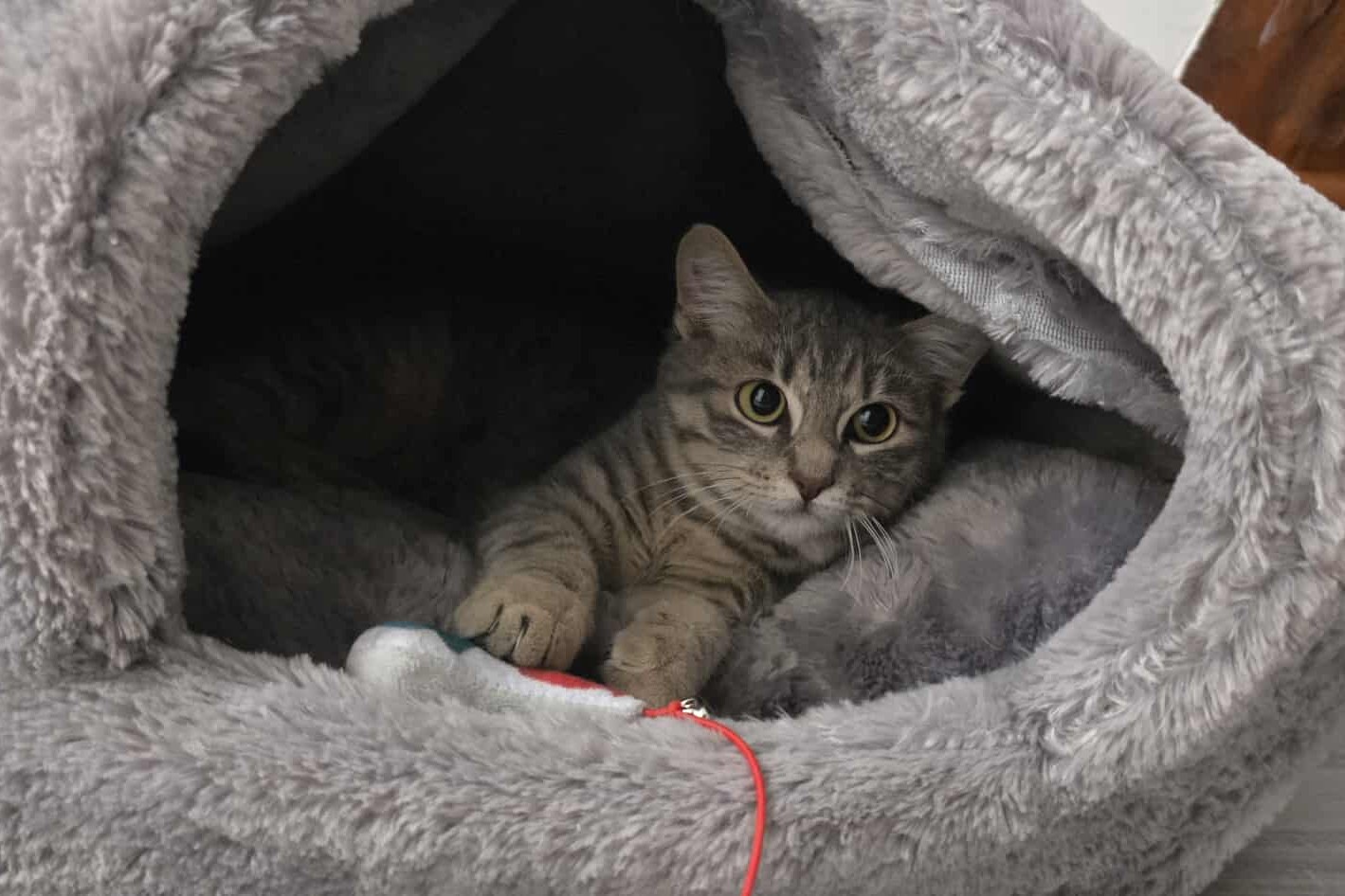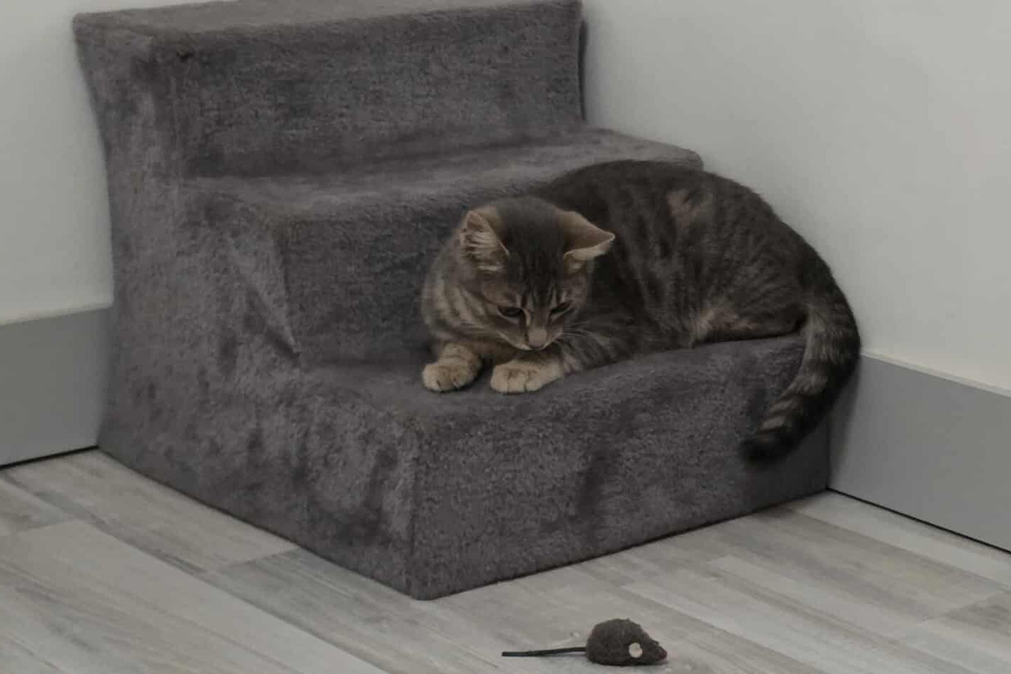 Achille adore jouer ! Il peut passer de longs moments à courir après une petite souris, un ressort ou tout autre jouet qu’il réussit à semer dans sa pièce d’accueil… Et puis, il y a notre rituel du soir, une séance de jeu avec la canne à pêche. Achille m’attend pour ce moment rien qu’à nous, où il saute, bondit, fait de petites roulades… un vrai plaisir à regarder 💛