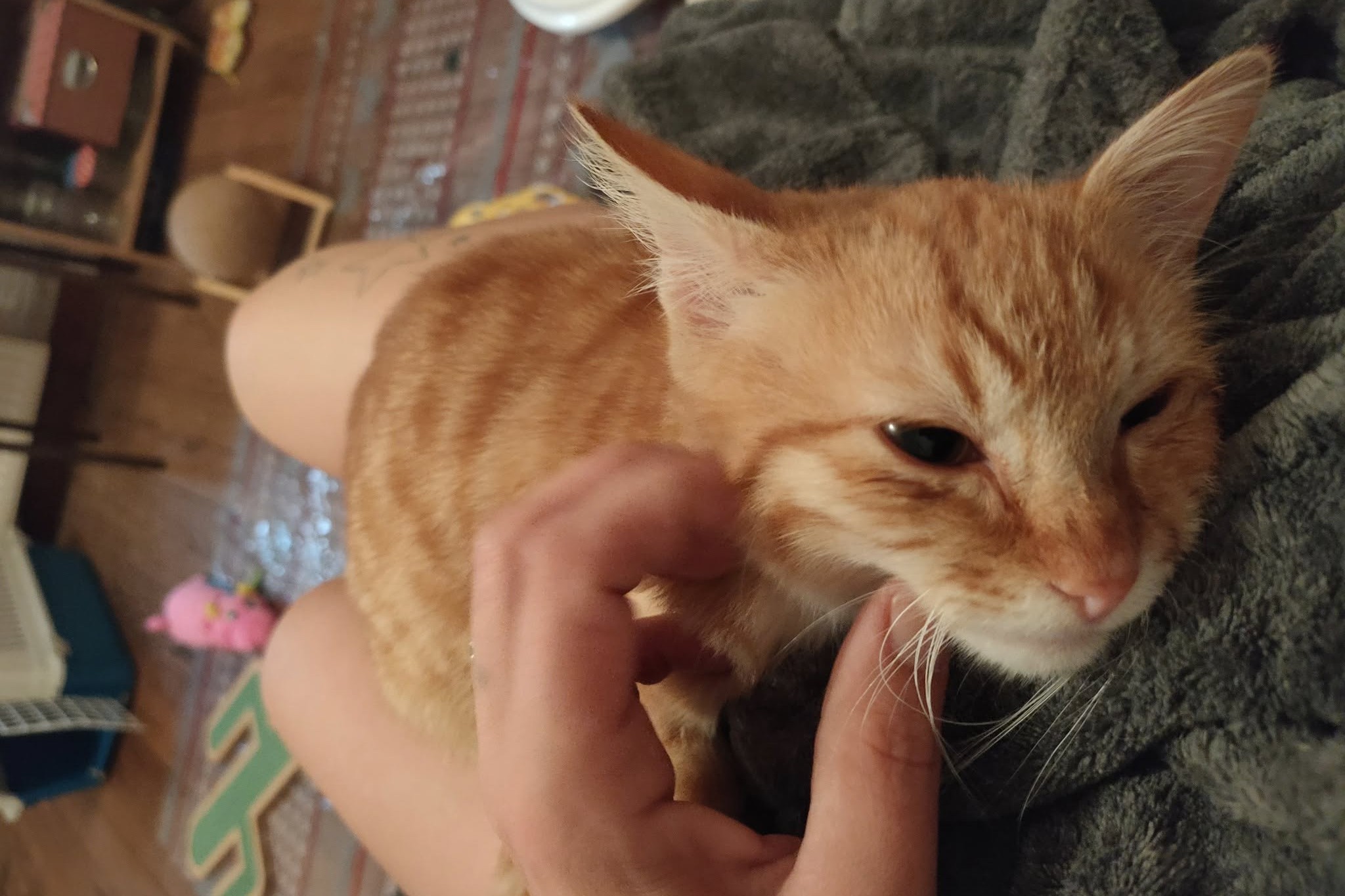 Automne est un chaton sociable, il aime venir s’installer sur les genoux afin de se faire câliner. Il ronronne rapidement sous les caresses de Charlotte ou ses enfants.