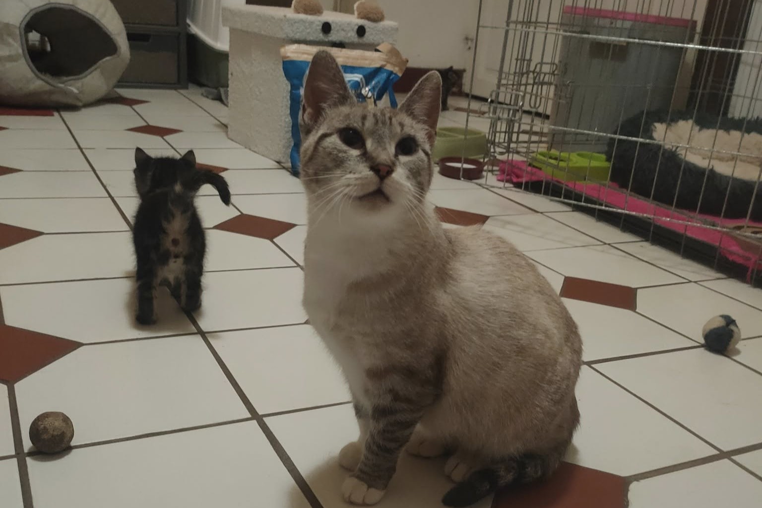 Estimée à 2 ans et demi par notre vétérinaire, Duchesse est une minette sociable, qui a donc eu des « maîtres » à un moment donné… A t’elle été abandonnée parce qu’elle avait des chatons ? 😿