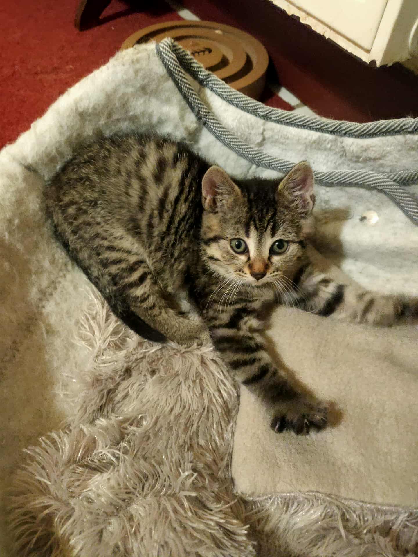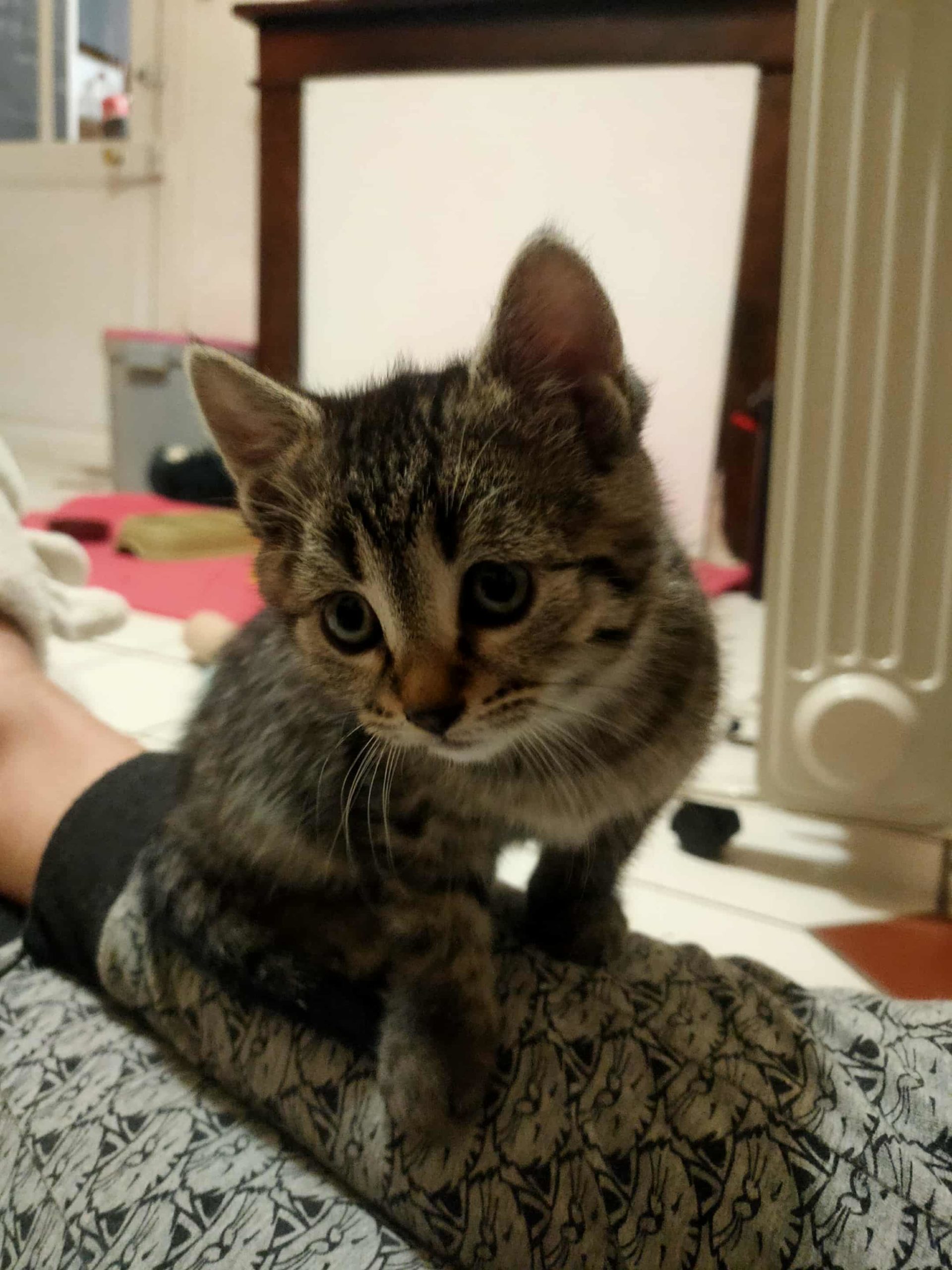 Cette petite boule de poils est une chatonne tigrée pleine de douceur et de curiosité 💛