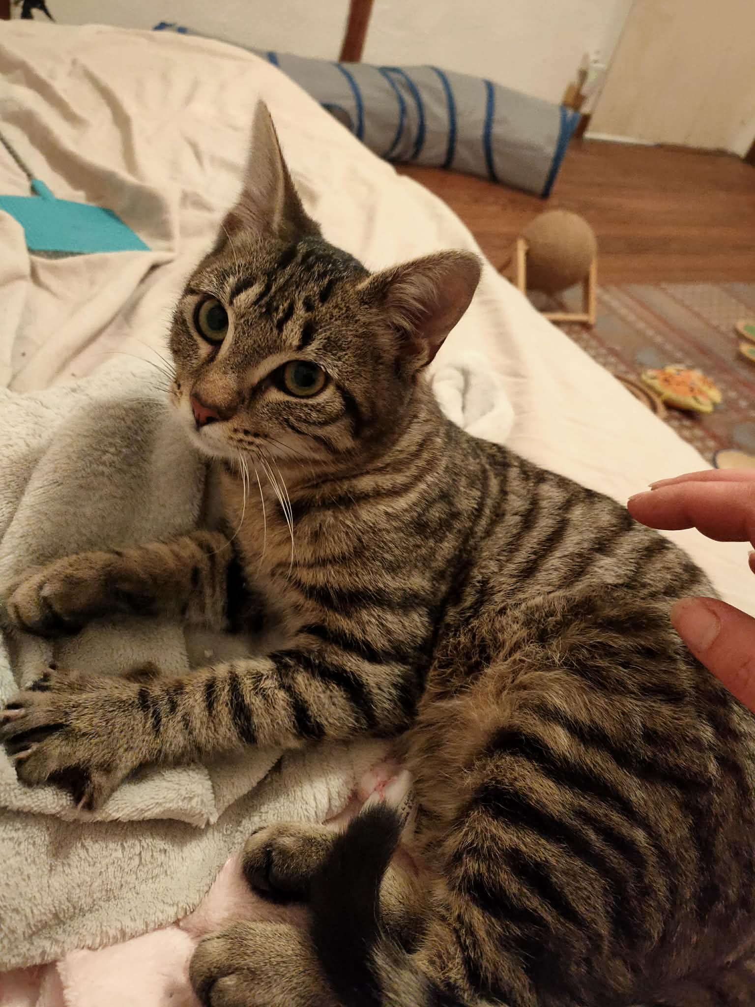 C’est aussi un jeune chat plein de vie. Il joue avec les balles, les souris et ses ressorts dès qu’il en a l’occasion, et il ne résiste jamais à une session de jeu avec Charlotte, surtout avec la canne à pêche. 🎣